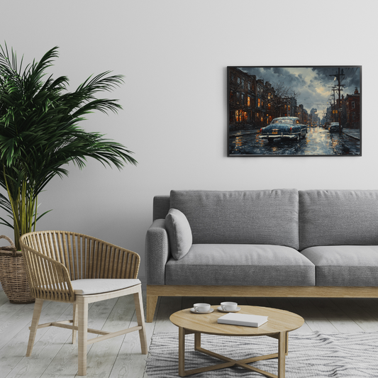 Evening Reflections - Classic Car in Urban Rain