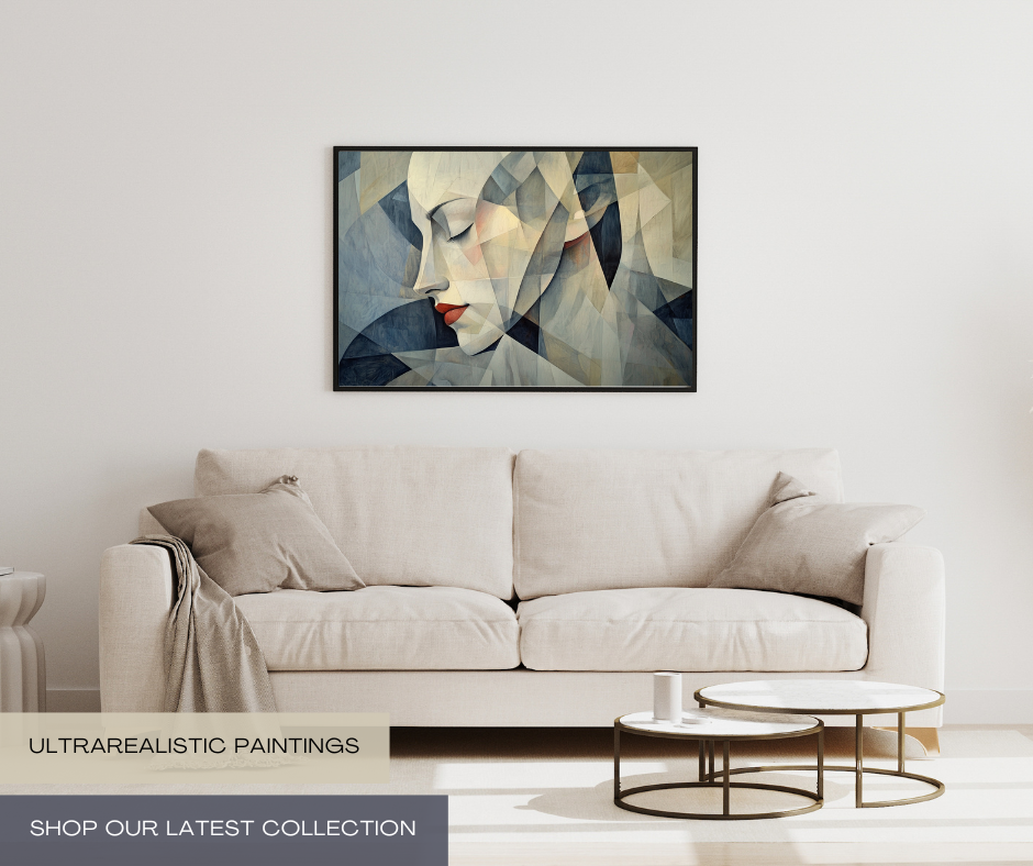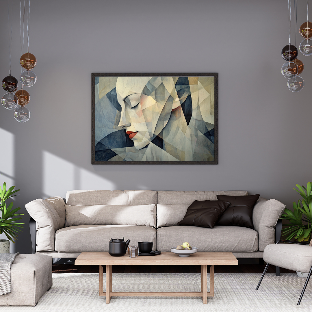 Eine eindrucksvolle kubistische Interpretation weiblicher Schönheit mit kühnen geometrischen Flächen in Blau- und Grautönen, wobei leuchtend rote Lippen den Mittelpunkt dieser raffinierten Komposition bilden.