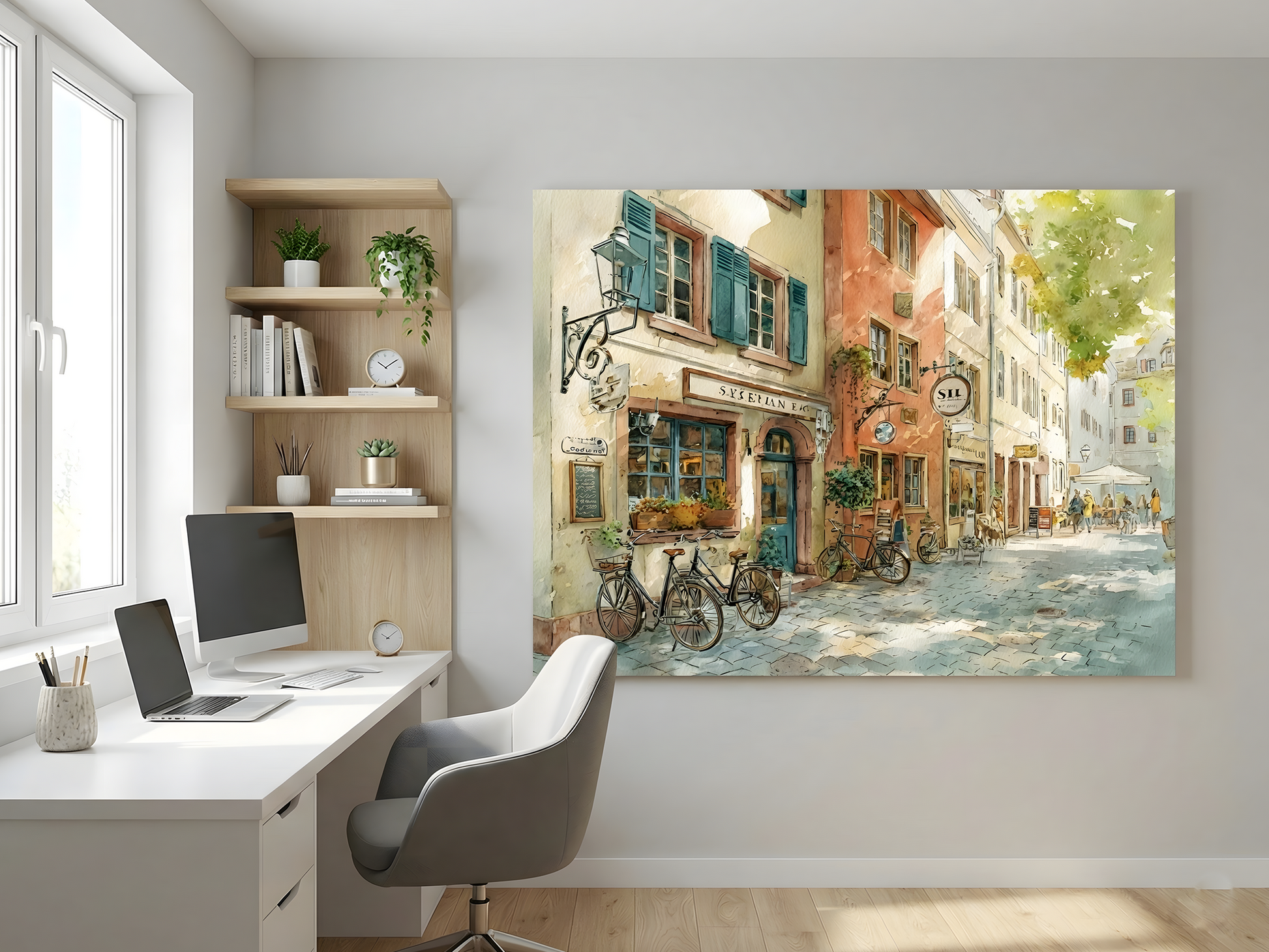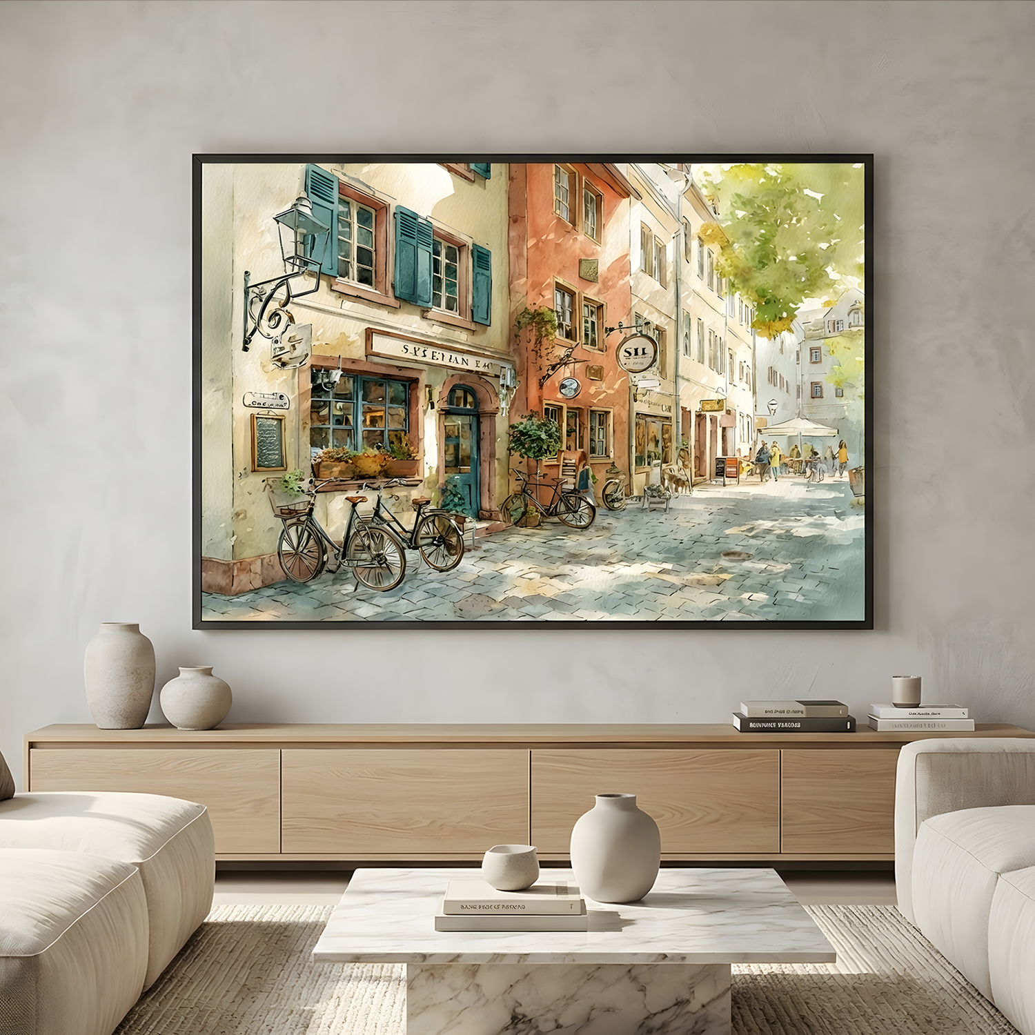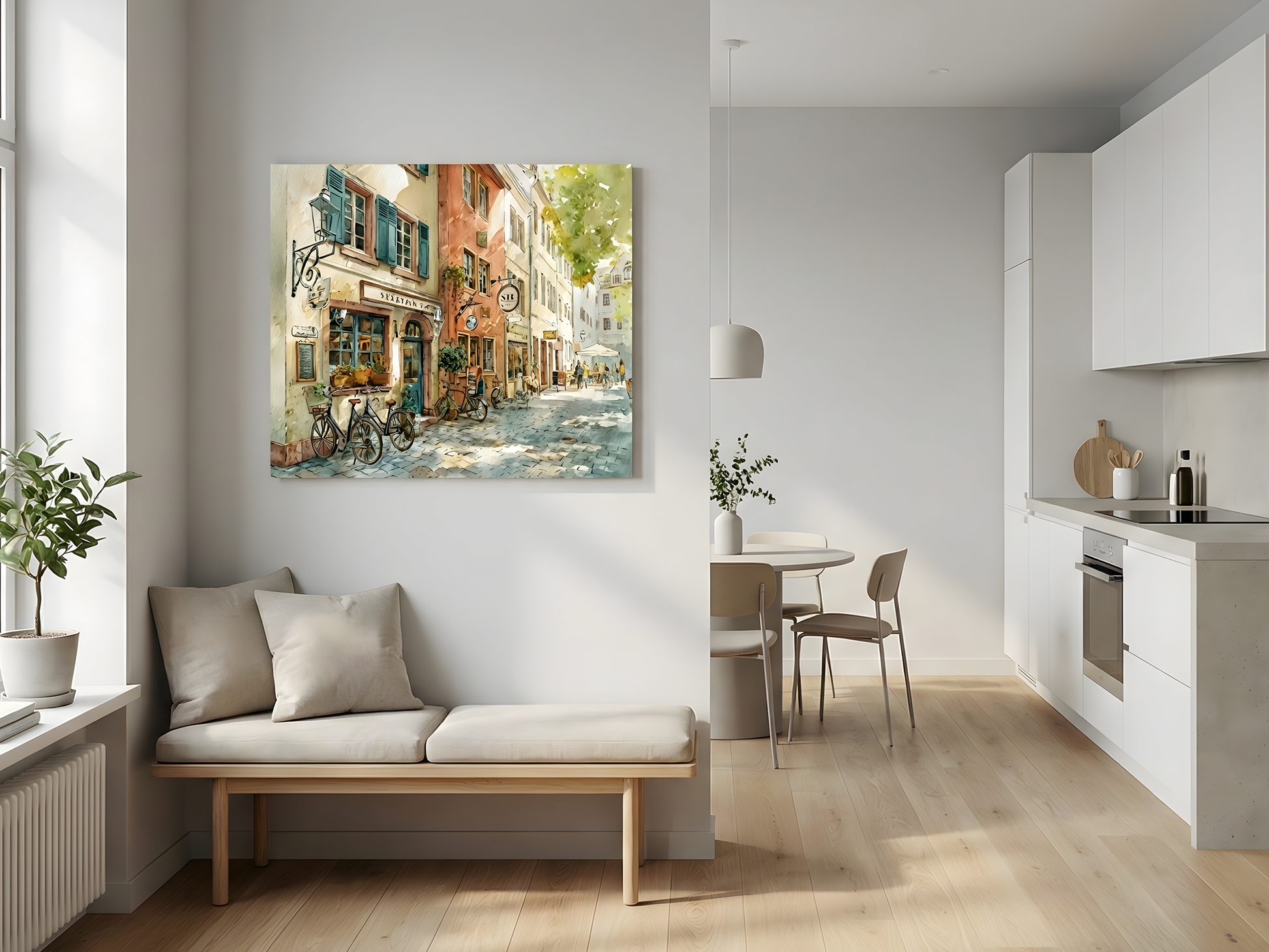 Ein Aquarellgemälde, inspiriert von einer historischen Straße in Frankfurt am Main, gesäumt von charmanten alten Läden und Schaufenstern, auf deren Bürgersteigen Fahrräder geparkt sind.