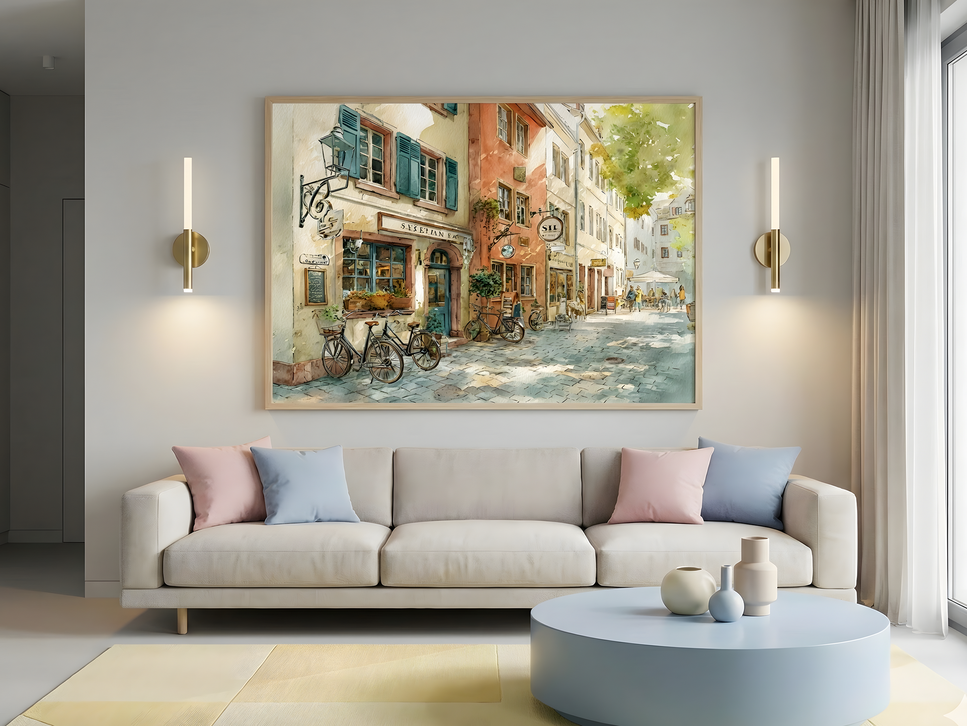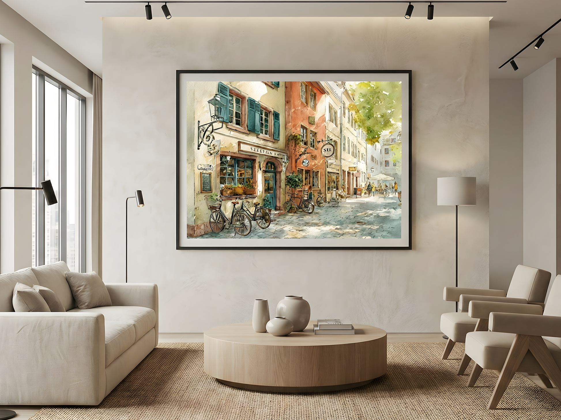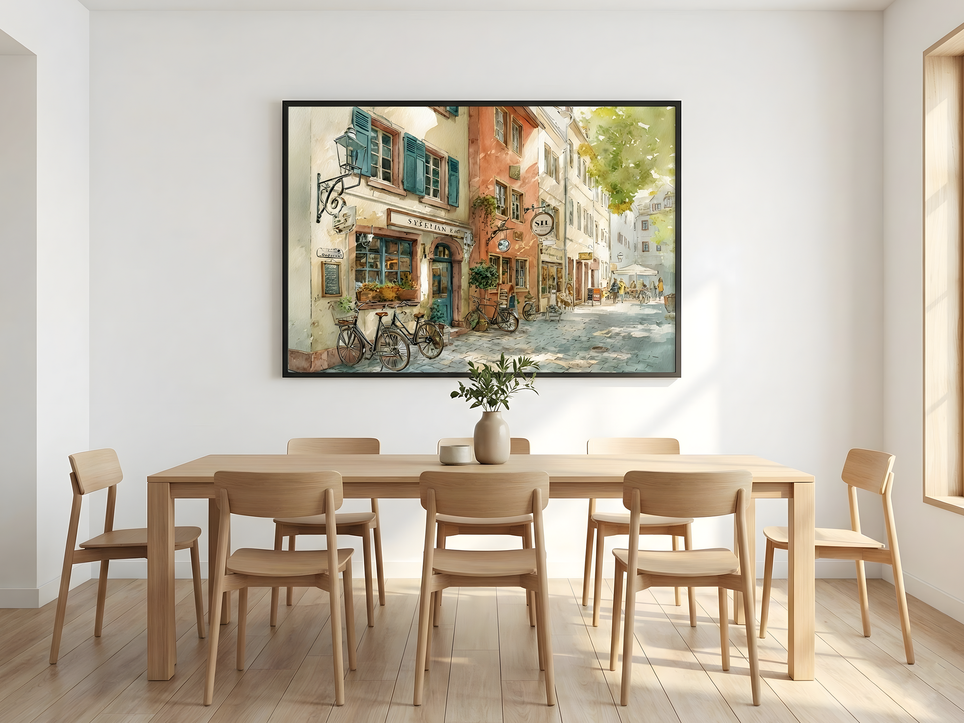 Ein Aquarellgemälde, inspiriert von einer historischen Straße in Frankfurt am Main, gesäumt von charmanten alten Läden und Schaufenstern, auf deren Bürgersteigen Fahrräder geparkt sind.