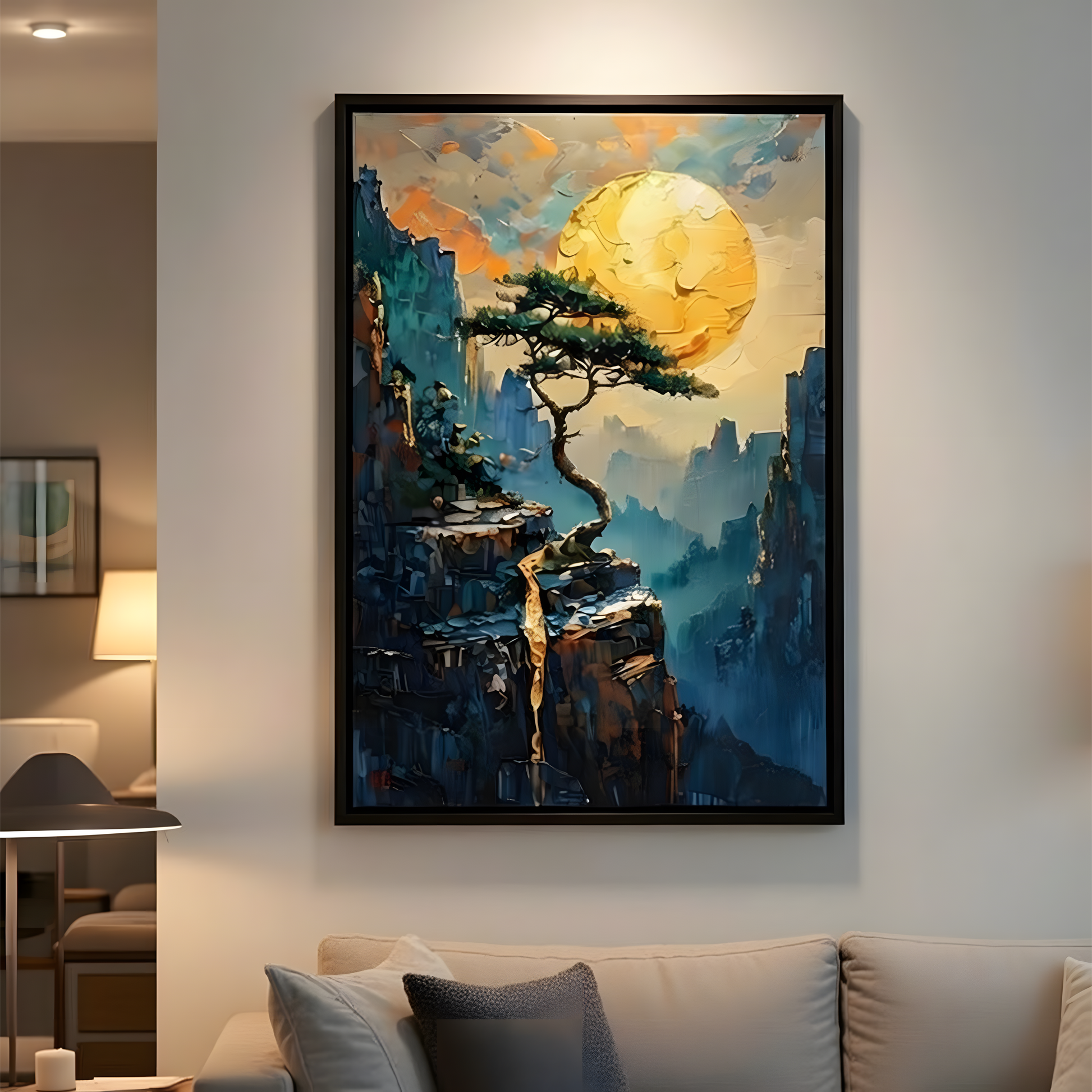 A surreal moonlit landscape where a glowing golden moon rises above dramatic cliffs and a solitary tree. Rich textures and deep blues create a sense of calm, mystery, and balance—perfect as a statement piece for modern or artistic interiors.