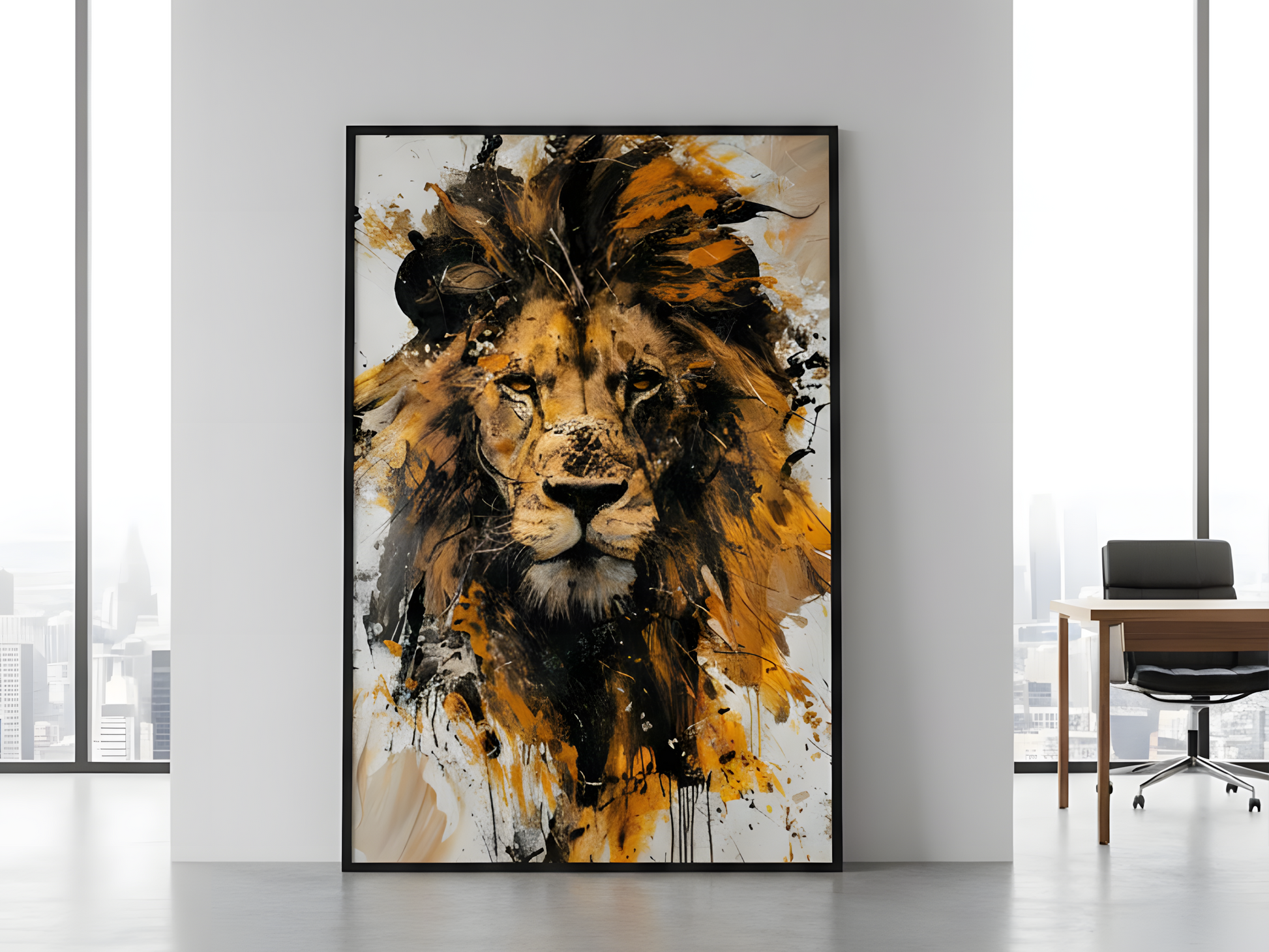 Holen Sie sich die ungezähmte Schönheit der Wildnis mit diesem beeindruckenden Löwenbild in Ihre vier Wände. Leuchtende Farbtupfer in Orange, Schwarz und Gold fangen die kraftvolle Präsenz des Löwen ein und machen es zu einem perfekten Blickfang für jedes moderne oder eklektische Interieur. Gedruckt auf hochwertiger Leinwand und elegant gerahmt.