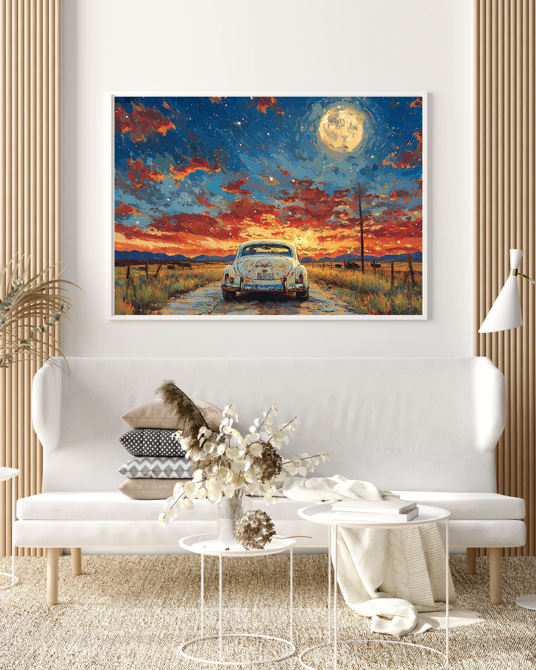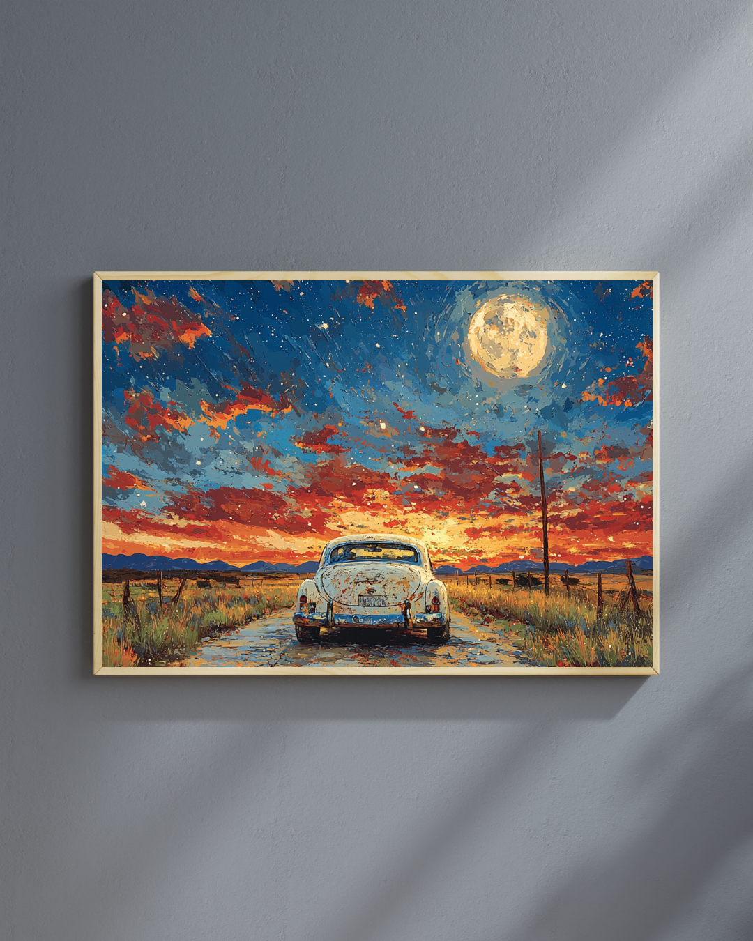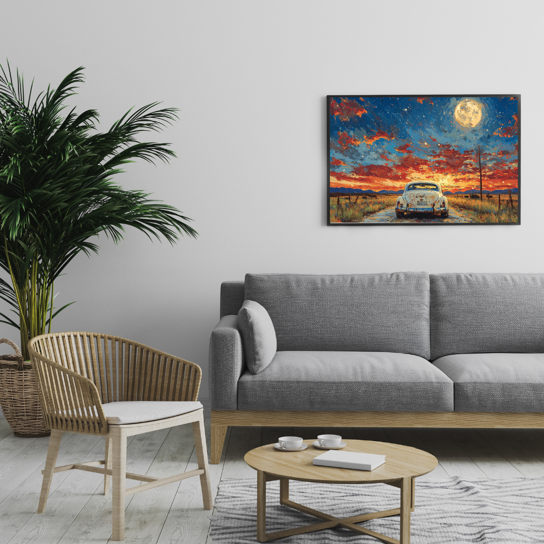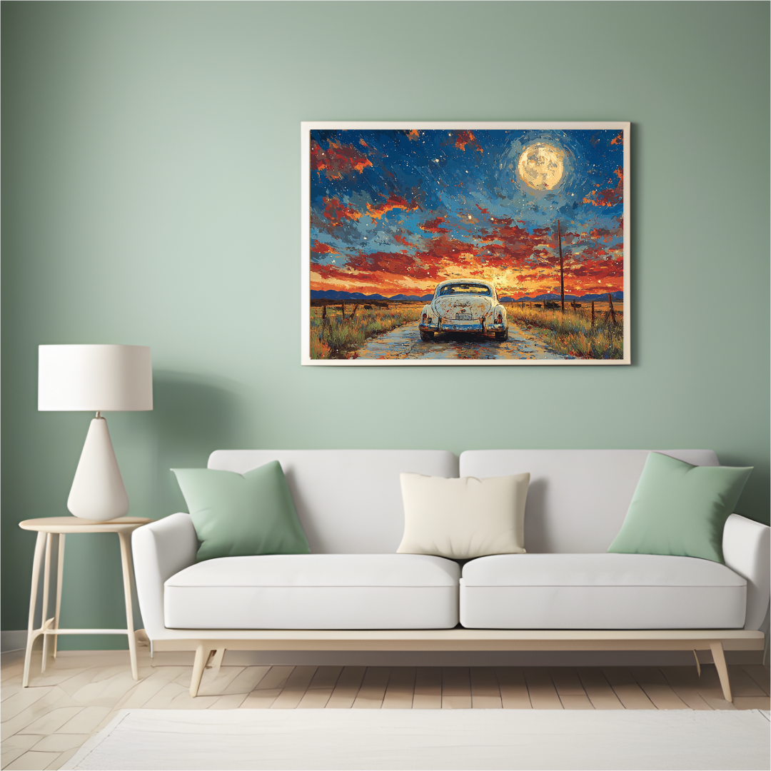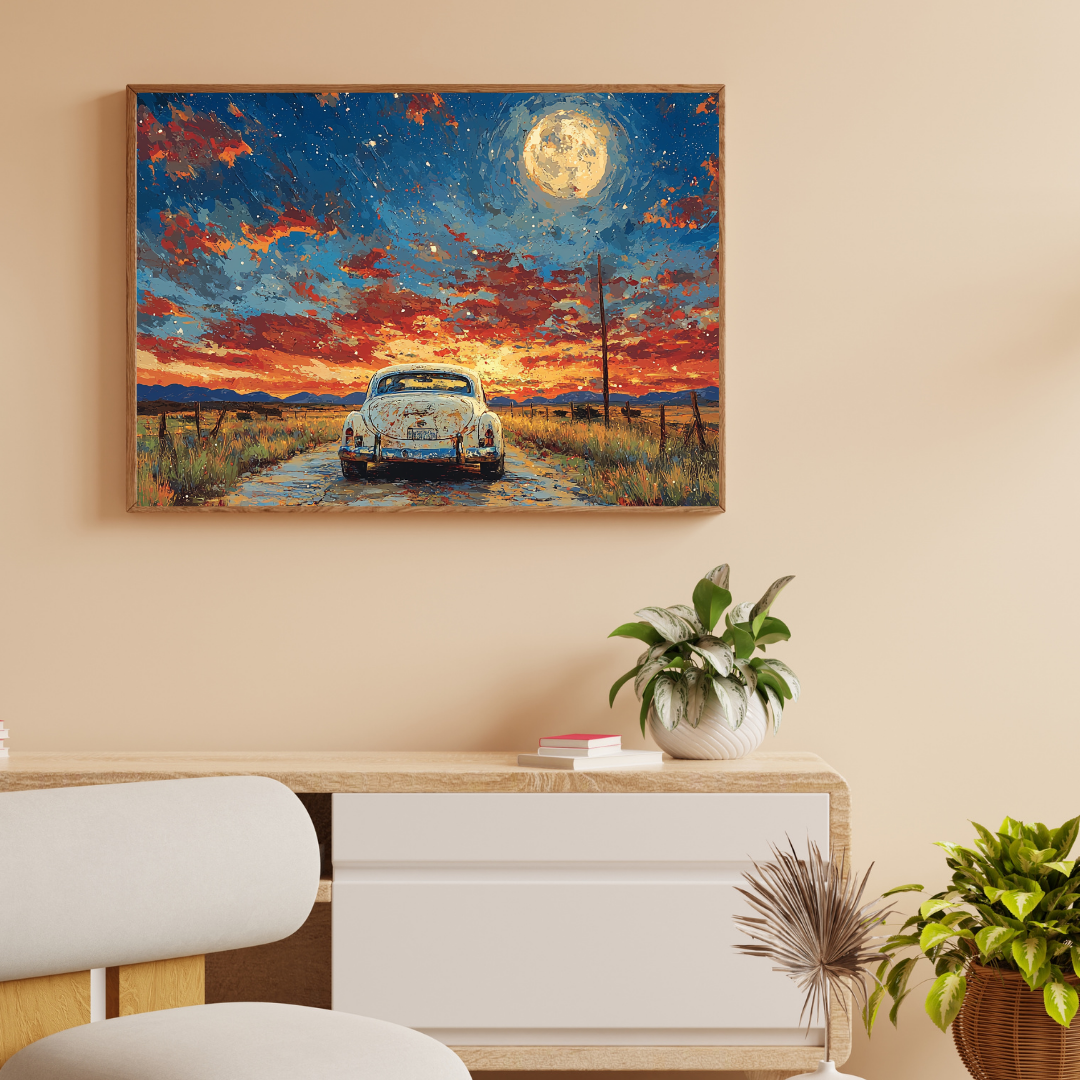 Erleben Sie die Freiheit der offenen Straße in diesem atemberaubenden Bild eines Oldtimers unter einem dramatischen Mondschein. Der strahlende Vollmond beleuchtet die dahinziehenden Wolken, während der Oldtimer friedlich auf einem endlosen Highway steht. Dieses stimmungsvolle Werk fängt den Abenteuergeist und die Romantik klassischer amerikanischer Roadtrips ein.